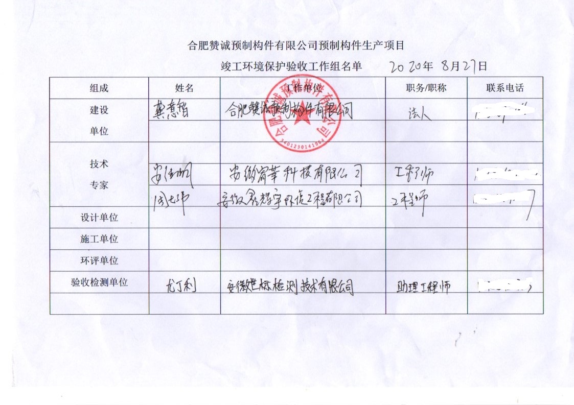 合肥贊誠預(yù)制構(gòu)件有限公司預(yù)制構(gòu)件生產(chǎn)項(xiàng)目竣工環(huán)境保護(hù)驗(yàn)收報(bào)告公示