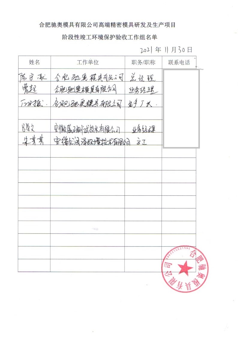 合肥馳奧模具有限公司高端精密模具研發(fā)及生產(chǎn)項目階段性竣工環(huán)境保護驗收報告公示