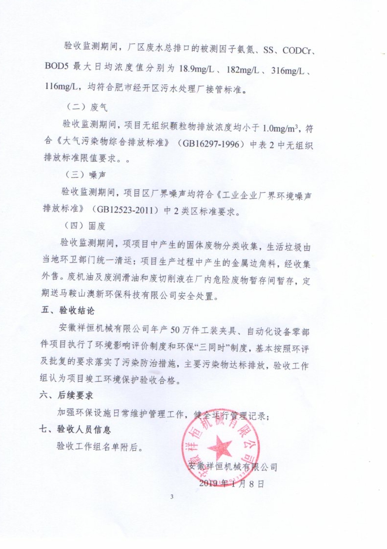 根據(jù)《國務(wù)院關(guān)于修改〈建設(shè)項(xiàng)目竣工環(huán)境保護(hù)管理?xiàng)l例〉的決定》(國務(wù)院令第682號(hào)),以及環(huán)保部《關(guān)于發(fā)布<建設(shè)項(xiàng)目竣工環(huán)境保護(hù)驗(yàn)收暫行辦法>的公告》(國環(huán)規(guī)環(huán)評(píng)[2017]4號(hào)),現(xiàn)將安徽祥恒機(jī)械有限公司年產(chǎn)50萬件工裝夾具、自動(dòng)化設(shè)備零部件項(xiàng)目竣工環(huán)境保護(hù)驗(yàn)收內(nèi)容公式如下: