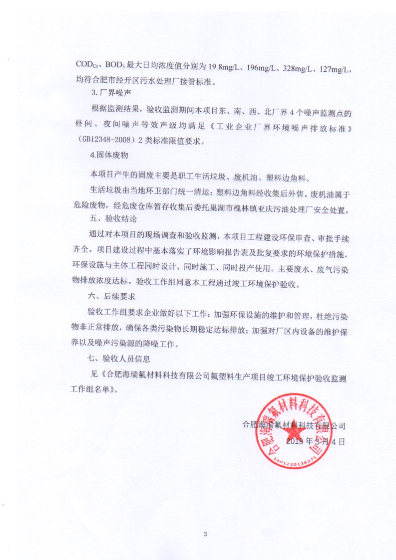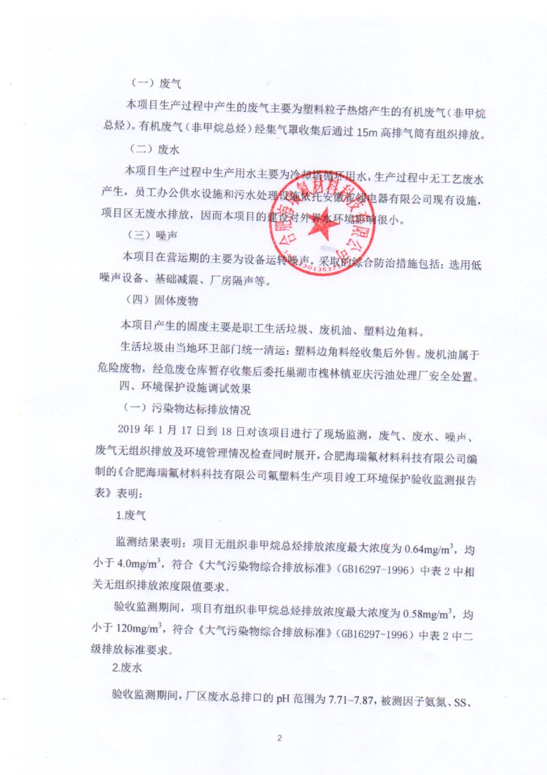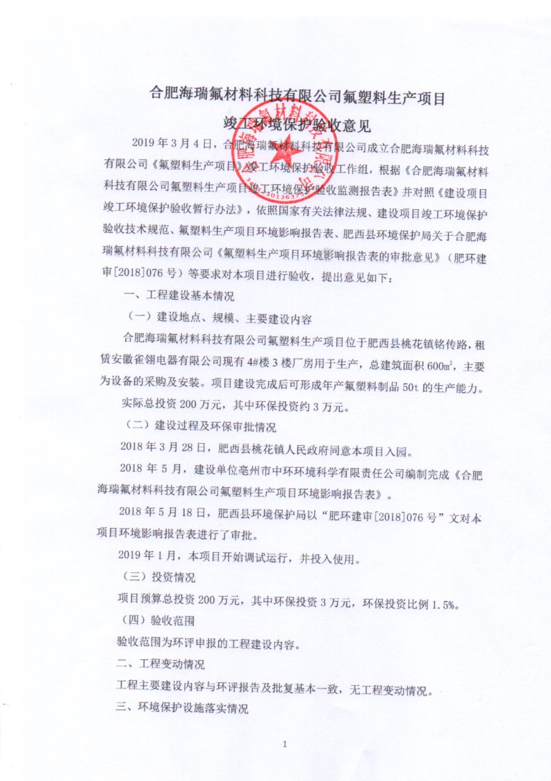 合肥海瑞氟材料科技有限公司氟塑料生產(chǎn)項目竣工環(huán)境保護(hù)驗(yàn)收報告公示